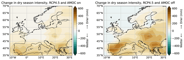 Studien Changing European hydroclimate under a collapsed AMOC in the Community Earth System Model er publisert i Hydrology and Earth System Sciences. Studien finner at en kollaps i den atlantiske havomveltningen (AMOC) utløst av menneskeskapte klimaendringer trolig vil ha stor påvirkning nedbør i Europa. I Sør-Europa og Øst-Europa ventes lengre og mer alvorlige tørkeperioder på grunn av klimaendringene. En kollaps i AMOC vil forsterke problemet ytterligere6.