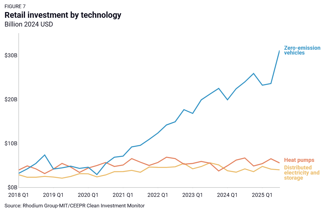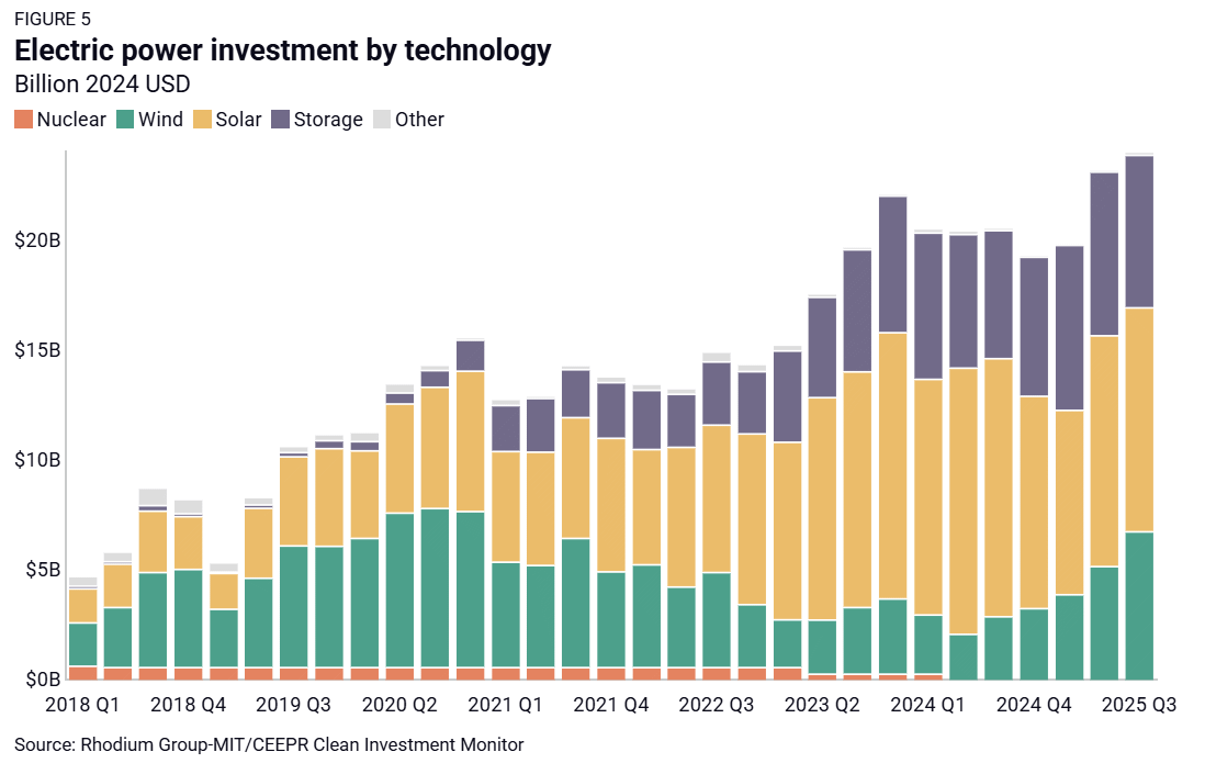 Rhodium Group og MIT CEEPR har publisert Clean Investment Monitor Q3 2025 Update. Investeringene bare fortsetter å øke i USA, på tross av at behovet i batterisektoren trolig er dekket og investeringene her dermed faller. Vindkraft og kjøp av elbiler trekker nå opp. Det siste er trolig en midlertidig effekt forbundet med fjerning av subsidier10.