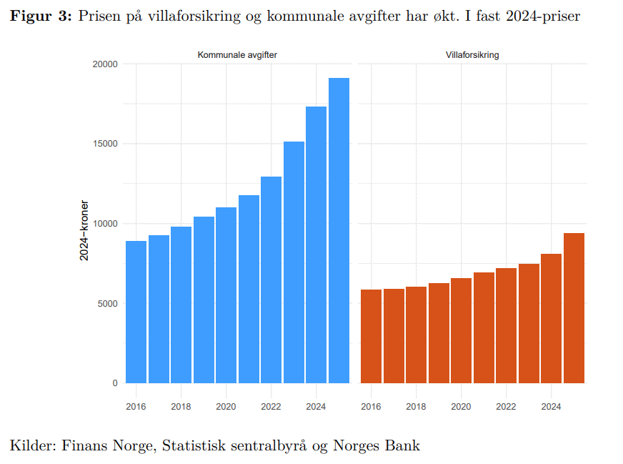 I et staff memo fra Norges Bank fremgår det at skadeutbetalinger for boliger har økt markant de siste årene. Økte værrelaterte skader kan de neste årene føre til økte kostnader for dem som eier egen bolig. Det skjer både gjennom økte forsikringskostnader og økte skatter og avgifter når kommunene må håndtere utsatt infrastruktur. Om lag 13 prosent av norske boliger og 11,5 prosent av norske boligverdier ligger i områder som er særlig utsatt for naturskaderisiko og andre værrelaterte skader5.