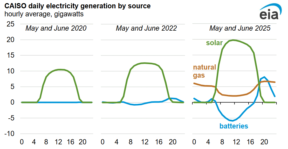 Energy Information Administration (EIA) skriver at veksten i solkraft, og nylig også batterier, fører til betydelig redusert bruk av gass i California21.