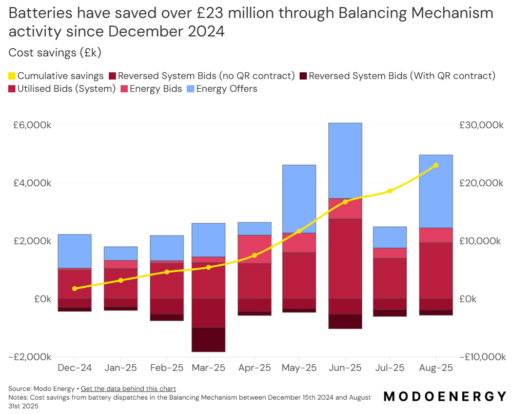 Batteriboomen har såvidt startet i Storbritannia. I en ny analyse skriver Modo Energy at batterier sparte britiske strømkunder for 317 mill. kr.Valutakurs per 1. juli 2025. i balansekostnader mellom desember 2024 og august 2025. Batterier kan ta seg av balansebehovet til lavere kostnader enn andre kraftressurser17.