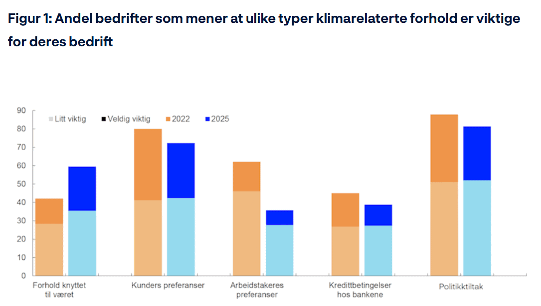 En kartlegging fra Norges Bank viser at andelen bedrifter som trekker frem klimarelatert politikk og kunders klimapreferanser er på et høyt nivå, og har vært relativt stabil siden en tilsvarende undersøkelse i 2022. Arbeidstakeres preferanser er viktig for færre bedrifter enn før, mens klimaforhold knyttet til været er viktig for stadig flere4.