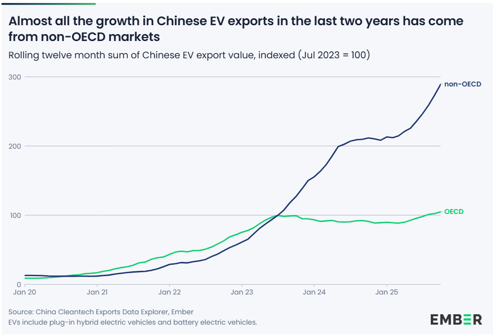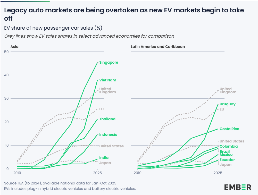 I 2019 utgjorde elbiler (inkludert plugin hybrider) 3 prosent av bilene solgt globalt. Mellom januar og oktober 2025 var andelen over 25 prosent. Ember skriver at fremvoksende økonomier ikke lenger tar igjen, men nå leder skiftet. Disse landene har tatt hele verdiveksten av kinesisk elbileksport siden 202326.