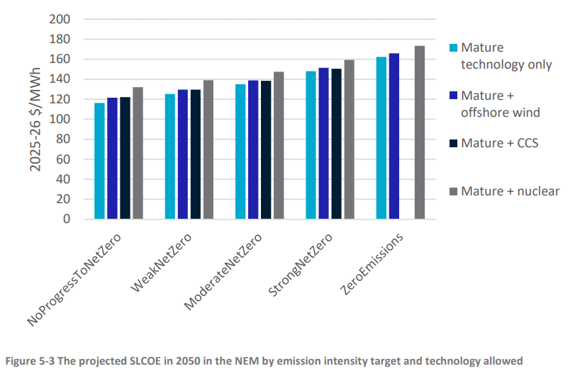 Det australske forskningsrådet CSIRO har sendt utkastet til GenCost 2025-26 på høring. Her modelleres kostnader for utvikling av kraftsystemet i Australia. Årets rapport er oppdatert med samlede systemkostnader inkludert kostnaden for integrering av fornybar energi. Frem mot 2030 skal andelen fornybar energi øke til 82 prosent. Dette vil gi betydelig reduserte strømpriser. Mot 2050 vil kostnadene øke igjen når de siste prosentene utslipp skal fjernes. Utslippene bør kuttes der de billigst og det er ikke nødvendigvis i kraftsystemet. I et samfunnsperspektiv kommer CSIRO til at scenarioene ModerateNetZero eller StrongNetZero vil være mest rasjonelt. Uansett hvor mye som må kuttes i kraftsystemet, bekrefter årets rapport at en kombinasjon av modne teknologier som solkraft, vindkraft på land, lagring og enten gass eller hydrogen er den billigste løsningen. Legges det til enten havvind, CCS eller kjernekraft, øker systemkostnadene. Havvind har en mye større kostnadsusikkerhet og kan gjøre det bedre med kostnadsutfall som ikke er vurdert nærmere8.