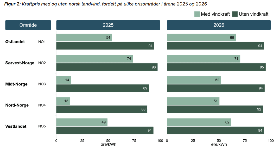 Fornybar Norge har bedt Thema Consulting beregne hva strømprisen ville vært i Norge uten vindkraft. Tas vindkraften bort fra det norske kraftsystemet, forsvinner nesten hele kraftoverskuddet. Og da går prisene i taket. Særlig stor er forskjellen i Midt- og Nord-Norge hvor vindkraft utgjør en større andel kraftproduksjonen9.