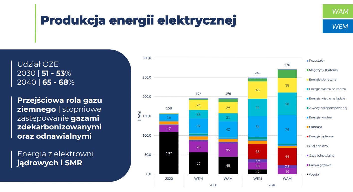 Polens regjering har etter høring oppdatert utkastet til energi- og klimaplan for 2030. Utkastet inkluderer også utsikt til 2040. To scenarioer beskrives, ett kalt WEM og et akselert scenario kalt WAM. WAM gir høyere investeringer innledningsvis, men lavere energipriser over tid og økt økonomisk bærekraft. Sammenlignet med 2025 ventes energikostnader å falle med 8 prosent i 2030 og 18 prosent i 2040. Andelen fornybar energi vil i 2030 øke til mellom 51,6 prosent (WEM) og 53,2 prosent (WAM). Utslippene vil falle med 43-53 prosent i 2030 og i 2040 med 61-75 prosent. Fra slutten av 2030-tallet planlegges kjernekraft innfaset med 15-16 prosent av kraftproduksjonen i 2040, med naturgass som overgangsbrensel13.