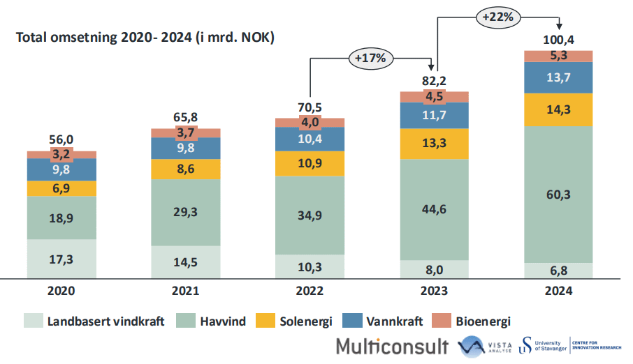 Energidepartementet har publisert rapporten Kartlegging av de norske energinæringene 2024 utarbeidet av blant andre Multiconsult. Leverandørnæringen innen petroleum er fortsatt størst, og den vokste i 2024. Samtidig er det sterk vekst i norsk havvindnæring. Fra 2023 til 2024 økte omsetningen til 60 mrd. kr. og sysselsettingen økte med 20 prosent39.