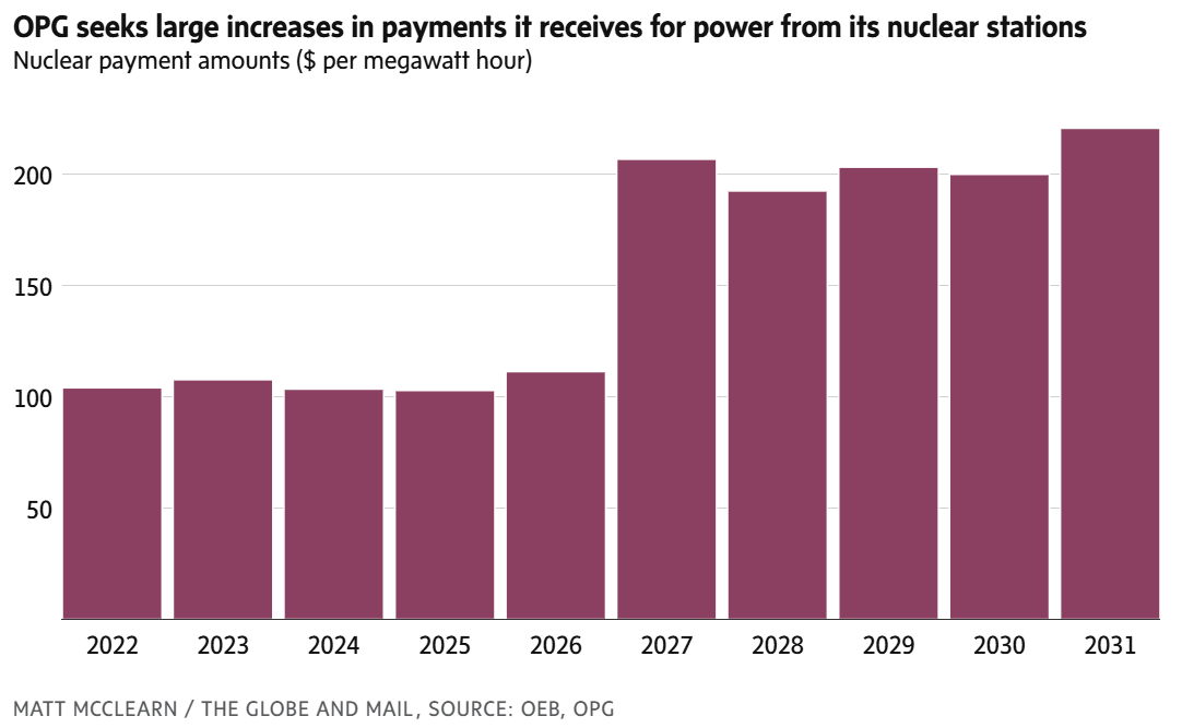 The Globe and Mail skriver at Ontario Power Generation søker om mer enn dobling av prisen for kjernekraft. OPG er et integrert energiselskap hvor prisen for kraft levert av kjernekraftverkene må godkjennes av reguleringsmyndigheten. Kostnadene blir deretter fordelt ut over alle kundene. Strømprisen for husholdninger ble justert opp 29 prosent i november blant annet grunnet en uventet kostnadsøkning for kjernekraft. Økningen ble kompensert med økt strømstøtte fra skattebetalerne. I årene som kommer må nå prisene etter alt å dømme ytterligere opp. Fra 2026 til 2027 øker prisen for kraft levert av OPGs kjernekraftverk fra 0,82 kr.Valutakurs per 1. januar 2026. til 1,51 kr.Valutakurs per 1. januar 2026. per kWh dersom søknaden blir godkjent. Om lag en fjerdedel av OPGs samlede prisøkning skyldes utbyggingen av små modulære reaktorer (SMR). En mindre del av denne investeringen finansieres av statlige fond. Men ingen private investorer er funnet så langt, så resten av investeringen på 153 mrd. kr.Valutakurs per 1. januar 2026. må nå finansieres av strømkundene. 60 prosent av prisøkningen skyldes levetidsforlengelse av fire reaktorer (2,1 GW) ved Pickering-kraftverket til 196 mrd. kr.Valutakurs per 1. januar 2026. Industrien i Ontario roper nå varsku om kraftpriser som går i taket. Industrien har allerede høye kostnader til dyr gasskraft når kjernekraftverkene stenges ned over lengre tid for levetidsforlengelser49.