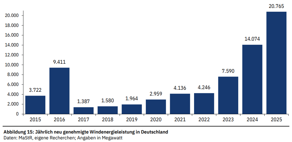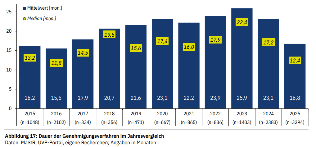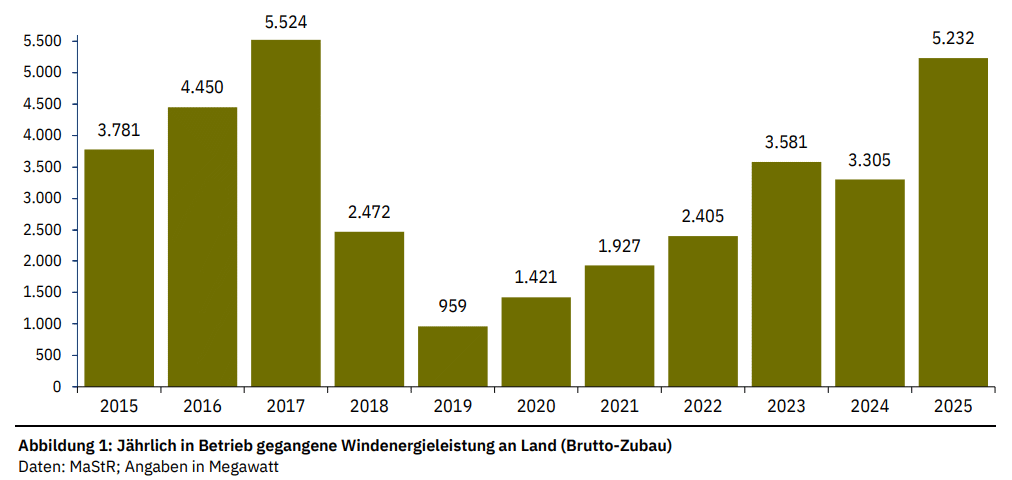 Fachagentur Wind und Solar har publisert rapporten Status des Windenergieausbaus an Land in Deutschland. 20,8 GW20,8 GW tilsvarer 52 prosent av Norges samlede installerte kapasitet i 2023 (energifaktanorge.no). vindkraft på land fikk tillatelse i Tyskland i 2025. Det er nok en rekord og auksjonene er stadig overtegnet. 5,2 GW ny vindkraft på land ble satt i drift og i 2026 blir det trolig over 8 GW. Nettkapasitet er en stadig større utfordring. Tyskerne har fått ordentlig fart på saksbehandlingen. Median saksbehandlingstid har gått fra over 22 måneder i 2023 til litt over 12 måneder i 2025, tross langt flere saker til behandling6.