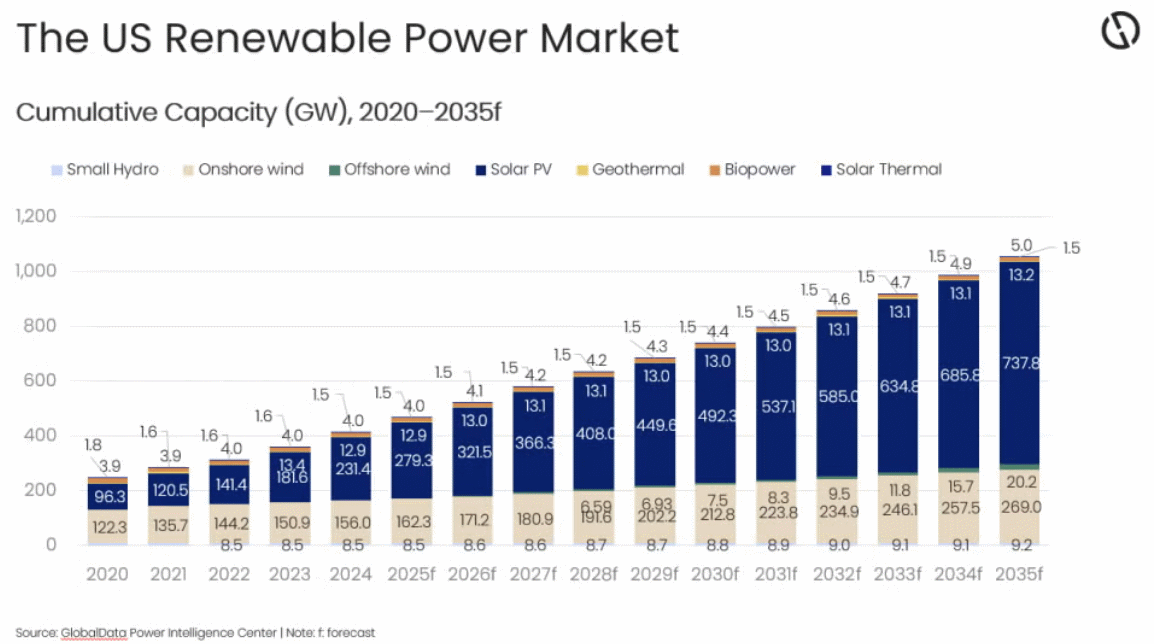 GlobalDatas prognose viser at USA vil ha 1,06 TW fornybar energi i 2035. Delstater, anskaffelser fra energiselskaper og langsiktige kraftkjøpsavtaler vil sørge for at sol- og vindkraft mer enn dobles på ti år. Kull- og oljekraft ventes å gå ned, mens gass øker fra 573 til 621 GW. Kjernekraft øker fra 97 til 102 GW, først og fremst på grunn av restart av nedlagte kraftverk og effektoppgraderinger31.