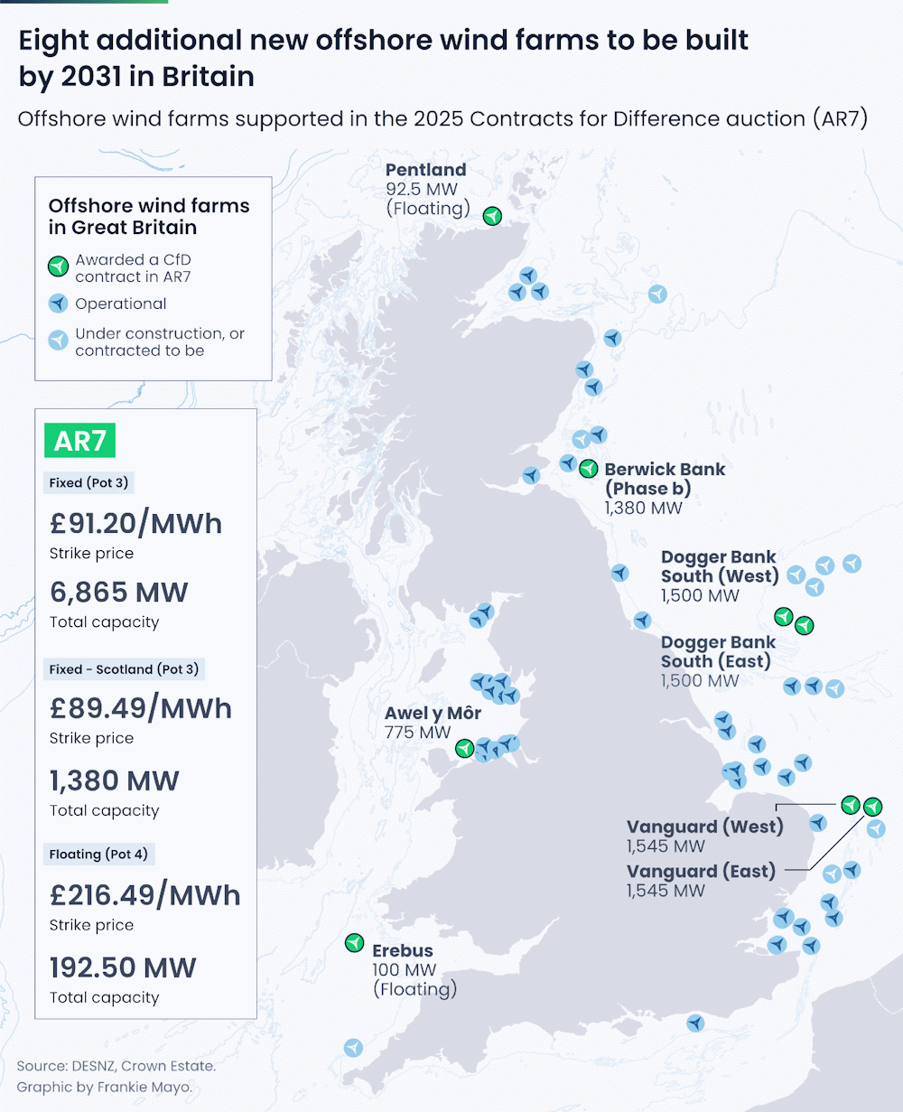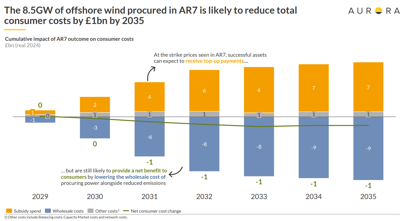 Britenes syvende havvindrunde omstales i energikretser som en stor suksess. Det ble tildelt differansekontrakter for hele 8,4 GW8,4 GW tilsvarer 21 prosent av Norges samlede installerte kapasitet i 2023 (energifaktanorge.no). ny havvind1. Parkene er fordelt landet rundt og vil dra nytte av ulike vindforhold og tilkobling ulike steder i nettet. Oppnås ytterligere 7 GW i neste runde, er 2030-målet godt innen rekkevidde. To små ca. 100 MW piloter for flytende havvind fikk også kontrakt, til en pris på 2,93 kr.Valutakurs per 1. januar 2026. per kWh. For bunnfast havvind gikk kontraktene for 1,23 kr.Valutakurs per 1. januar 2026. i England og Wales og 1,21 kr.Valutakurs per 1. januar 2026. per kWh i Skottland. Prisene er 11 prosent høyere enn fjorårets runde og kontraktene forlenget fra 15 til 20 år. Men fortsatt er prisen 40 prosent under kostnaden for ny gasskraft - det eneste reelle alternativet på kort sikt. Kjernekraftverket Hinkley Point C, også under bygging i Storbritannia, har til sammenligning en 35 års differansekontrakt på 1,78 kr.Inflasjonsjustert fra 2012 til 2024. Valutakurs per 1. januar 2026. per kWh. Havvindtildelingen ventes å utløse 298 mrd. kr.Valutakurs per 1. januar 2026. i private investeringer. Utbyggingen av fornybar energi har redusert strømprisene med om lag en fjerdedel så langt2. Aurora Energy Research skriver at AR7 i sum mest sannsynlig vil kutte strømkundenes kostnader med 14 mrd. kr.Valutakurs per 1. januar 2026. årlig3.