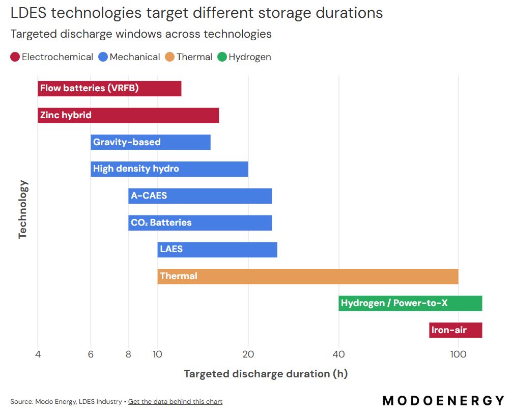 Modo Energy skriver at det er satset store beløp på mange ulike teknologier for langtids lagring av strøm. En rekke land gjennomfører eller planlegger anskaffelser av åtte timers lagring eller mer. Prisfallet for litiumion-batterier gjør imidlertid at slike batterisystemer er konkurransedyktige for stadig lengre lagringsperioder. Det legger press på utviklerne, som er på ulike stadier av teknologisk modenhet. Modo Energy går gjennom de viktigste teknologiene, deres teknologiske modenhet og selskapene bak dem24.
