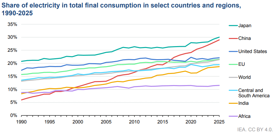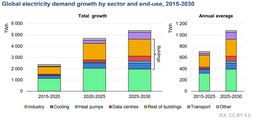 Det internasjonale energibyrået (IEA) har publisert rapporten Electricity 2026. Det IEA kaller Age of Electricity slår nå rot. Veksten i elektrisitet er 2,5 ganger så stor som samlet energibruk. Veksten drives av industri, elektrisk transport, air condition, datasentre og kunstig intelligens. Etter 15 år med stagnasjon, vil forbruket vokse også i avanserte økonomier. Fornybar energi er i ferd med å passere kullkraft, og utslippsfri strøm vil samlet øke fra 42 til 50 prosent i 2030. Gasskraft vil også øke, delvis på grunn av vekst i USA, men også for den erstatter annen fossil kraft. Utslippene fra kraftsektoren globalt antas å begynne peke nedover1.