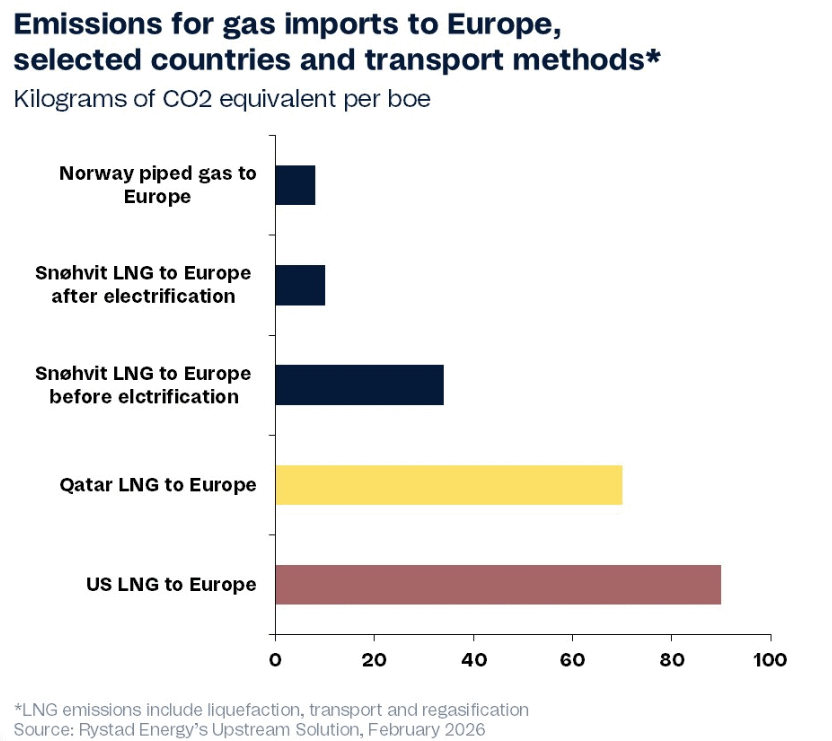 Rystad Energy skriver at EU revurderer sin arktispolitikk. Det kan åpne opp for større volumer med gass fra Barentshavet, forutsatt at det gjøres drivverdige funn og at det er infrastruktur til å frakte gassen sørover. For EU kan det betyr mindre behov for gass fra andre deler av verden. I tillegg produseres norsk gass med betydelig lavere utslipp av klimagasser13.