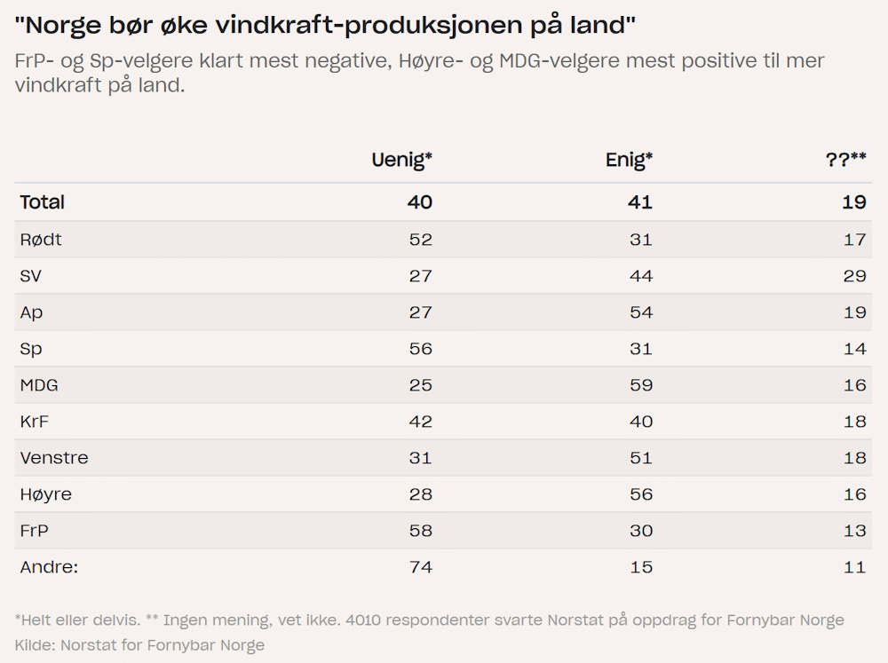 Dagens Næringsliv skriver at en meningsmåling tatt opp av Norstat for Fornybar Norge viser at det er like mange tilhengere som motstandere av å øke vindkraft på land. Men det er stor forskjell på velgerne til de ulike partiene. Mest positive er velgerne til MDG, tett fulgt av Høyres og så Aps velgere. Blant velgerne til de to sistnevnte er det dobbelt så mange tilhengere som motstandere av å øke vindkraft på land. Mest negative er FrPs velgere, tett fulgt av Senterpartiets og Rødts velgere. Svarene i undersøkelsen er om lag i tråd med lignende undersøkelser tidligere2.