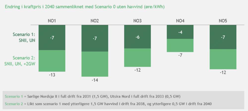 En beregning konsulentselskapene Volt Power Analytics og Boston Consulting Group (BCG) har utført for Offshore Norge viser at bygging av Utsira Nord på 500 MW og Sørlige Nordsjø II på 1 500 MW kan senke strømprisen med 0,07 kr. per kWh i 2040 sammenlignet med ingen utbygging. I perioden 2031-2040 vil det spare strømkundene for 185 mrd. kr. Prisområdet NO2 vil få den største effekten. Samlet planlegger staten å bruke 58 mrd. kr. på de to prosjektene. Dersom det i tillegg bygges ut ytterligere 2 000 MW havvind, vil priskuttet dobles1. Flere tidligere analyser har vist reduserte strømpriser, alt annet likt, hvis havvindparkene bygges ut.