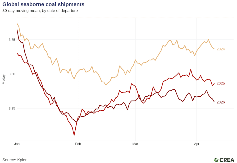 Centre for Research on Energy and Clean Air (CREA) skriver at bruken av kullkraft ble redusert i mars sammenlignet med samme måned året før i land som publiserer løpende data. Det har vært fryktet at forstyrrelsene i energimarkedene på grunn av angrepet på Iran skulle føre til økt bruk av kull på kort sikt. Så langt har dette ikke skjedd, snarere tvert imot. Sammenlignet med samme måned i fjor brukes det mindre kull, mens sol- og vindkraft øker betydelig. Det skipes også mindre kull enn årene før17.