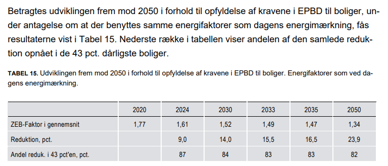 Det danske klimarådet er enda litt mer optimistisk i sine vurderinger: "Klimarådet vurderer, at Danmark ikke skal energirenovere boligmassen mere end tidligere år for at overholde direktivets forpligtelser frem mod 2035.5"